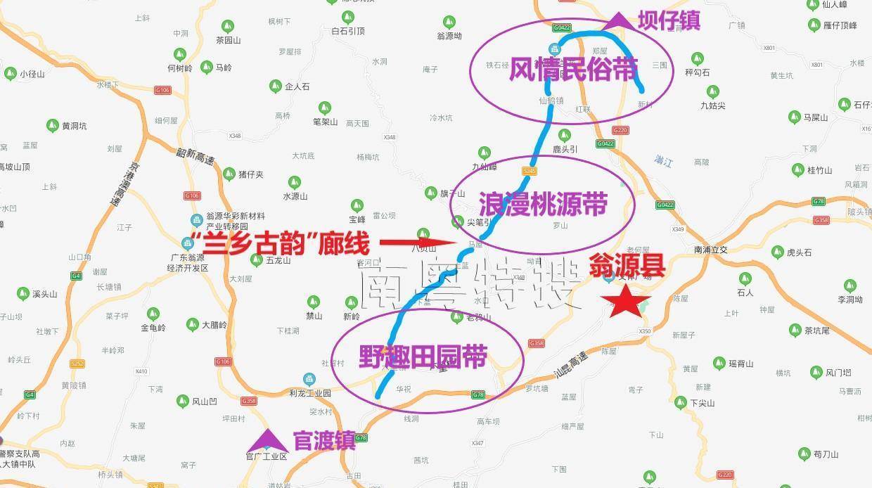 “兰乡古韵”廊线主要为S245省道六坝线沿线范围,涉及官渡、江尾、坝仔3个镇,总长约34公里。廊线内资源丰富,既有兰花、九仙桃等优势特色农业,又有湖心坝、八卦围等具有浓郁翁源客家风情的古村落和文化资源。