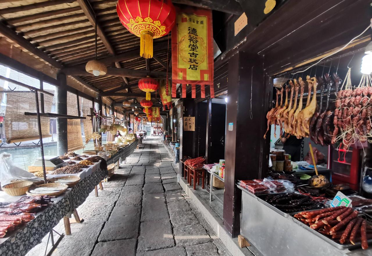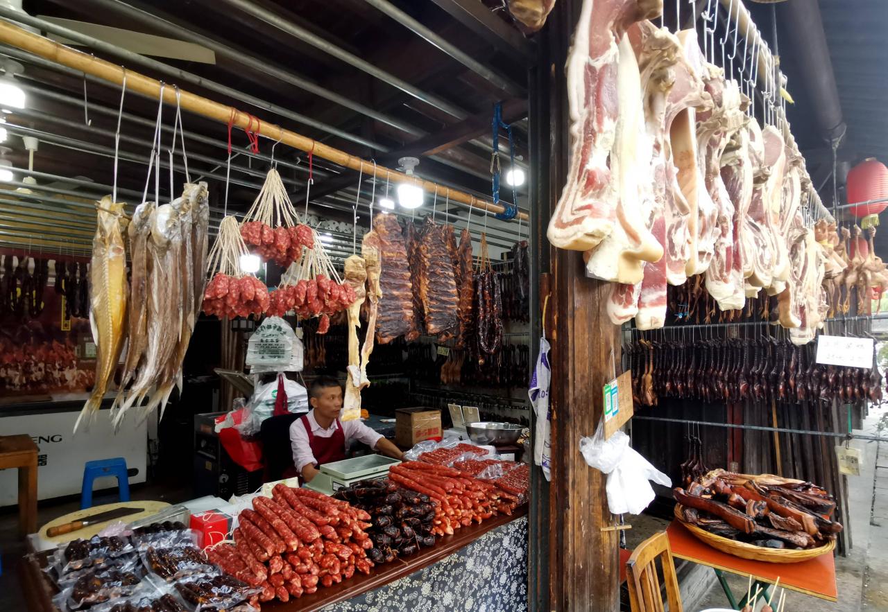 进的镇来,沿河随行,一路上都飘满了浓浓的肉香和酱香味。扎实的肉质,咸鲜的酱香,无论是下酒还是下饭,唇齿留香,让人回味无穷。自从在《舌尖上的中国》中露脸之后,安昌腊肠更是声名远播。