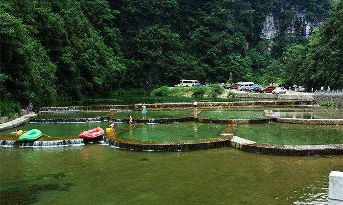 目前,双河溶洞只能开发一部分景区。目前,已经开发双河谷景区和地下裂缝景区,这其中以双河谷景区最有代表。双河谷景区是地下河谷、天坑组成的一个景区,是国内目前唯一开发的地下河谷景区,有地下溪流、地下瀑布、地下梯田等景观,洞内还有盲鱼、野生娃娃鱼等罕见的洞穴生物。在溶洞洞口还有多个瀑布,十分壮观。地下裂缝是全国唯一开发此类景观,长达13公里。由于溶洞比较长,在双河谷溶洞内开通了观光车。