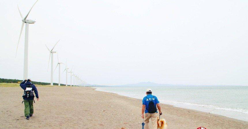 如果已经到过「白神山地」跟「风之松原」游览,建议这项健康健走行程可以参加「釜谷滨路线」,蒐集秋田的蔚蓝海景。主要行经的釜谷滨海水浴场,一到夏季就是当地家庭的玩水胜地,既可眺望日本海的美丽景色,又能仰望沙滩边排成一列的白色风车,还能小小享受一下海滩边松树林中的森林浴。值得一提的是,这边还有提供可以和导游的秋田犬伙伴一起散步的行程,有这么可爱的健行伙伴,走起来更是疗愈啊!