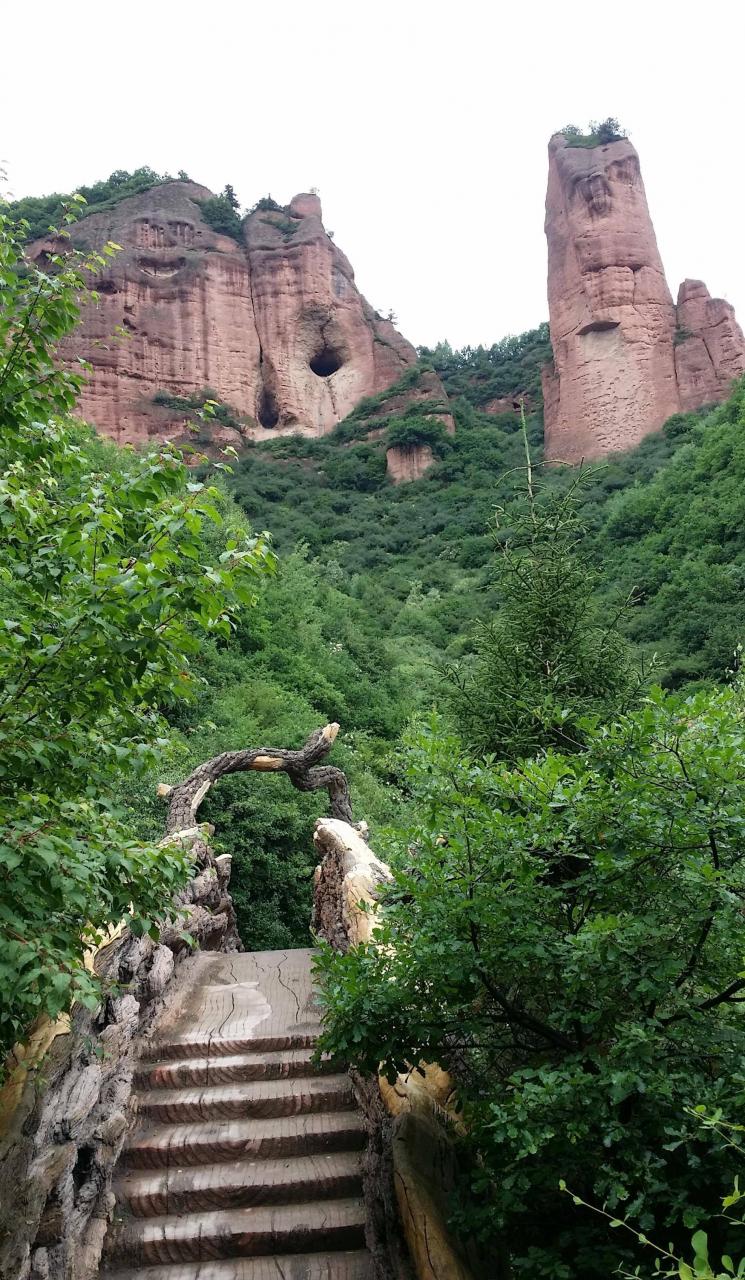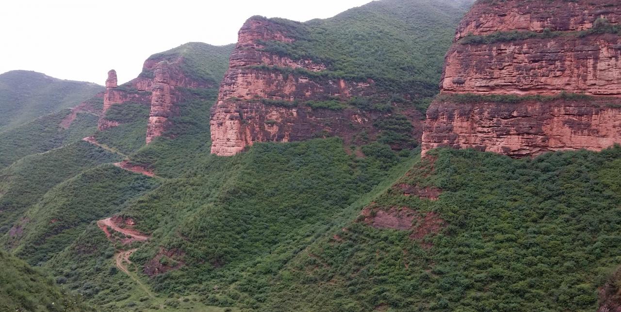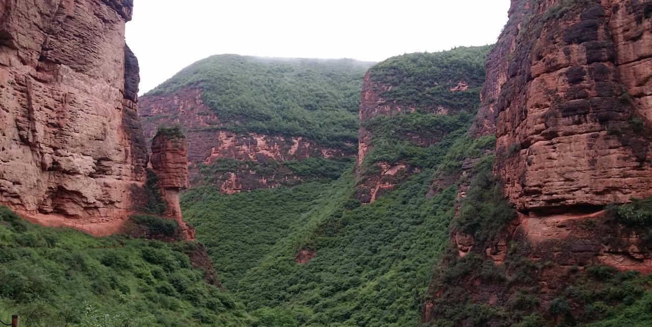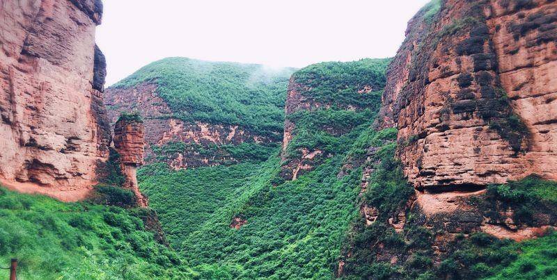该景区位于青灰色石灰岩的群山之中,为20千米长的丹霞地貌,算是奇葩的景区。它由四屏峰、伏莽崖等众多景点构成,典型的喀斯特丹霞地貌,谷底一款小溪,两侧全是禇红色的沙砾岩体,千万年的风雨侵蚀使两壁生成了千奇百怪的形状。