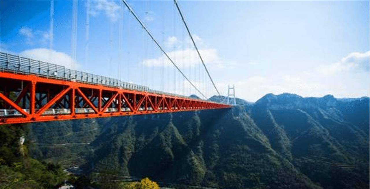 四渡河大桥全长约165米,桥梁距山谷底部约560多米,差不多有200层楼那么高,对比一下法国米约大桥以及美国科罗拉多州皇家峡谷大桥比着我们国家的四渡河大桥要矮307米和290米。所以,它是世界上当之无愧的最长悬索桥。