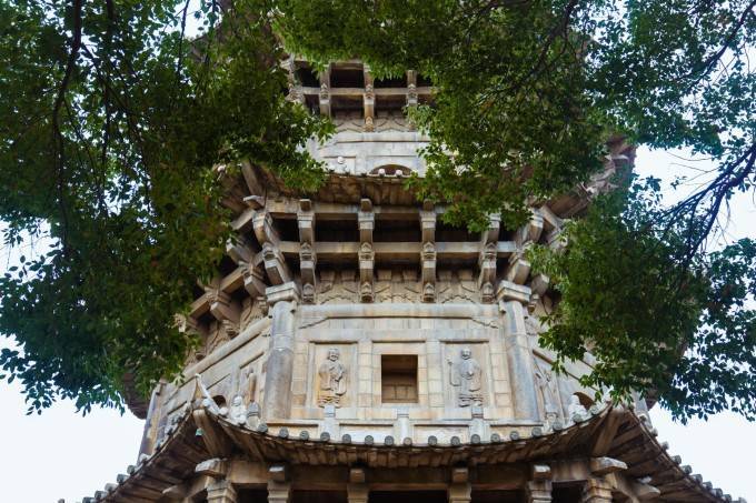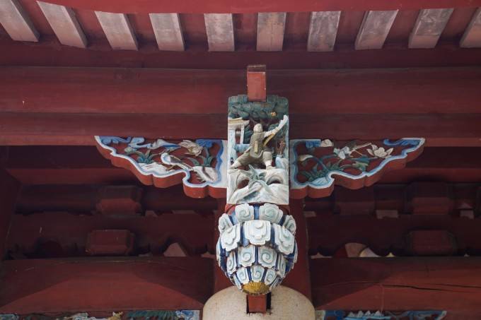 大雄宝殿的柱头斗拱,附刻带翅飞天乐使24尊,为国内古建筑上所罕见,殿前月台须弥座上刻172幅人面狮身青石浮雕,殿后廊的两根婆罗门教青石柱上刻着印度、锡兰等地流传的神话故事。
