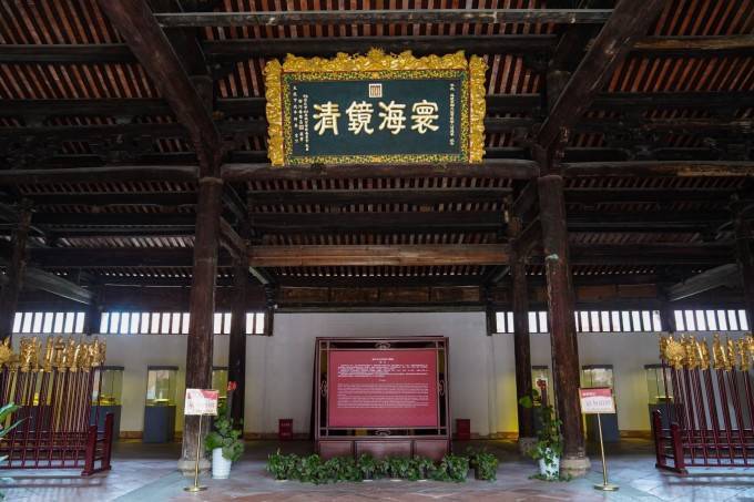 如今已是世界文化遗产点的泉州天后宫,依然保留着16世纪之前已然形成的“前殿后寝”建筑布局,是海内外众多天后庙宇的建筑范本。天后宫坐北朝南,占地面积7200多平方米。建筑群分布于南北中轴线两侧,主要有山门、戏台、拜庭、大殿、放生池、寝殿、梳妆楼。侧翼建筑有东西阙、东西厢房、东西轩、四凉亭、两斋馆。