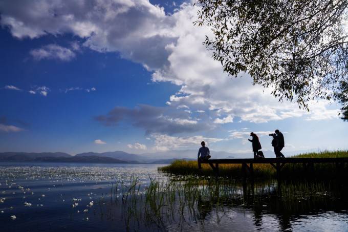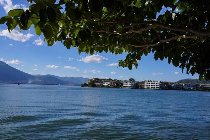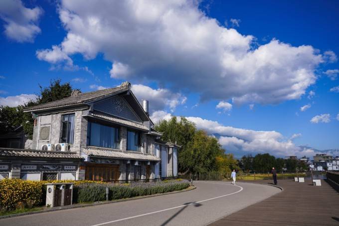 清澈的湖水,蔚蓝天空,时常有鸟儿成群的掠过,路边有成片的花朵、翠绿的草坪和高大的林树。人们相视而笑,穿行在大理美好的生活画面中。一边是蚕山洱海,一边是典雅古朴的白族民居建筑,浪漫从四面八方而来,跟你撞个满怀。