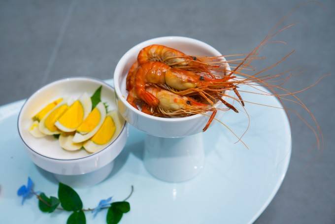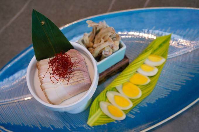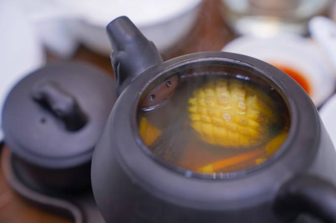 里面有鲍鱼、羊肚菌、虫草等,汤底鲜美甘甜,用精美的茶具做盛器,新颖别致,又符合诗句的意境。