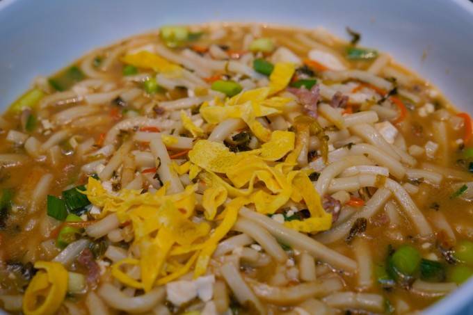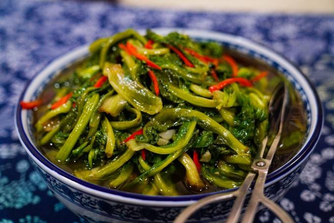 “天姥连天向天横”,这道菜菜名取自李白《梦游天姥吟留别》。其采用新昌最具特色的年糕作为主要食材,搭配咸菜、瘦肉,笋丝、鸡蛋等进行翻炒。年糕象征巍峨天姥山的形象,同时寓意“吉祥如意年年高”。