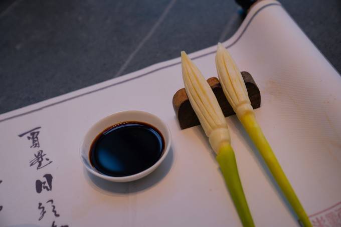 这道菜一出现就非常的吸引眼球,洁白如玉色的茭白在餐盘上呈现出诱人色泽,勾人食欲,一口下肚,那鲜甜的滋味,回味无穷,毛笔点墨的呈现方式,富有浓郁的诗书气。