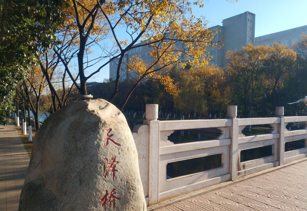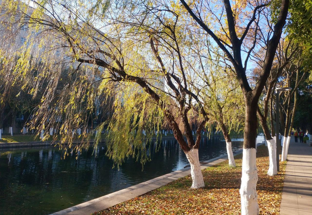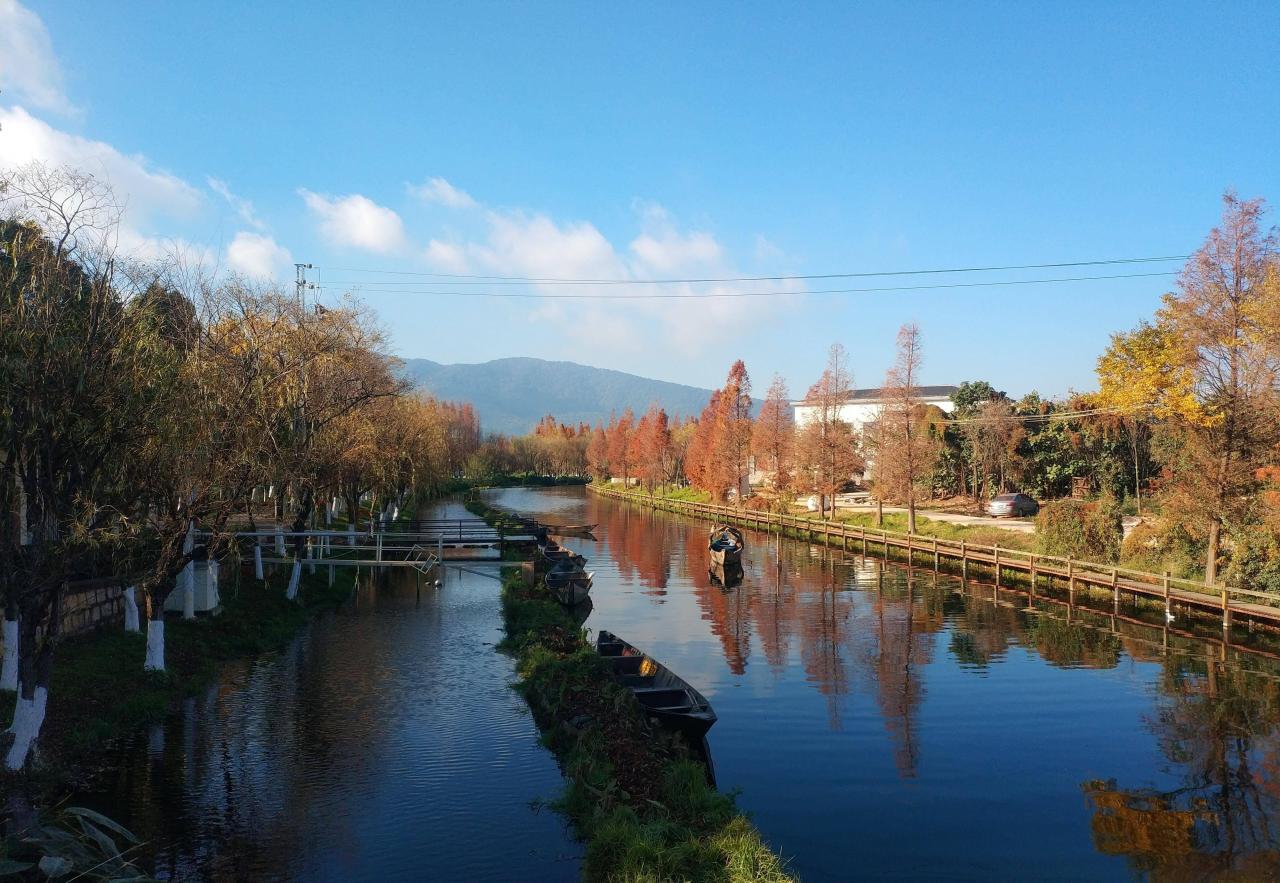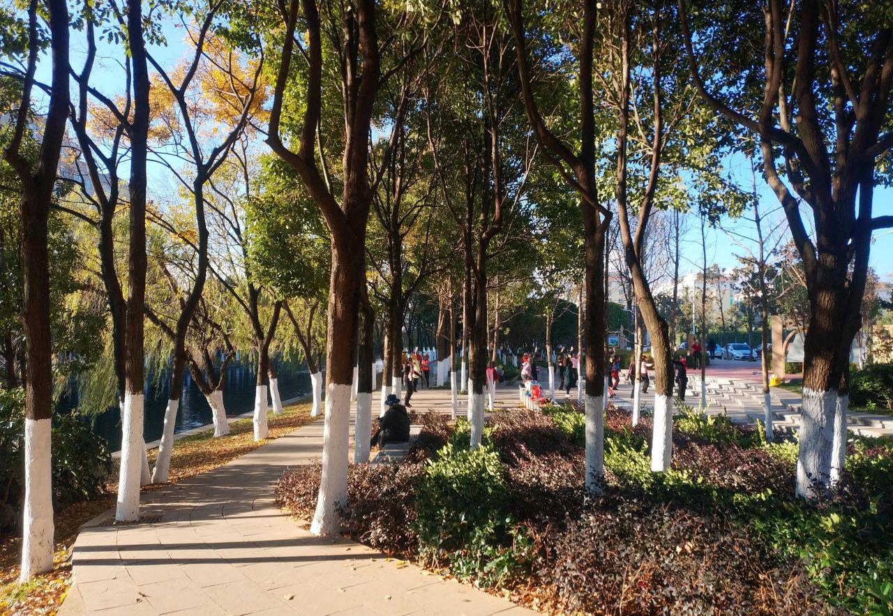 河边种有很多树木,按照品种分类种植、间隔整齐,不同的树种呈现了不同的色彩,滇朴的叶子已变黄、阳光下金灿灿的;香樟树还是浓荫绿叶,枫香树已是红黄相间,地上铺满了厚厚的落叶;石头小径在树林间延伸,如茵的草地相伴其间......