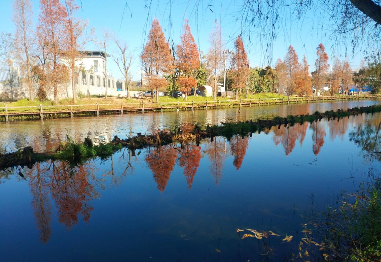 河道一侧有一排整齐的水杉,红色、黄色、绿色相间的树叶组合在宝塔型的树干中,岸边一条长长的木质栈道弯弯曲曲,倒映在蓝莹莹的水面上,大块大块鲜艳的色调组合,融入了静谧如镜的河水中,像极了一幅立体感极强的油画。