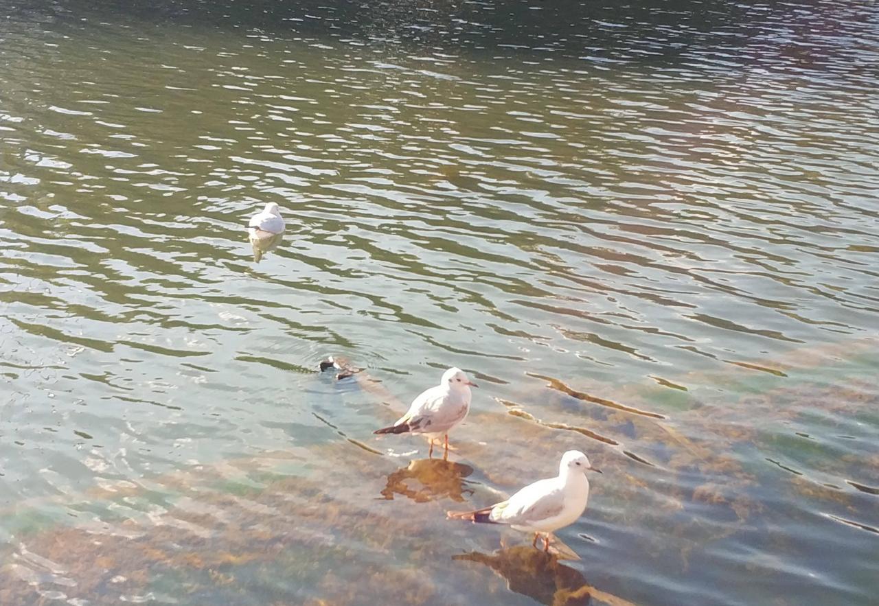 不时看到有人坐在岸边,手里握着面包、鸥粮一类,为红嘴鸥投食喂养。红嘴鸥也不客气,三三俩俩、独自行动,飞来、啄食、离开,人安静地坐在那里、海鸥优雅的觅食......