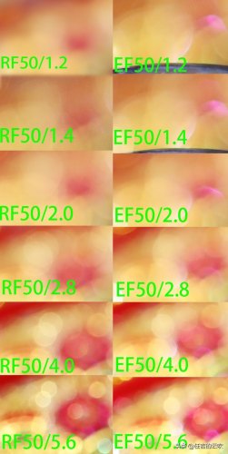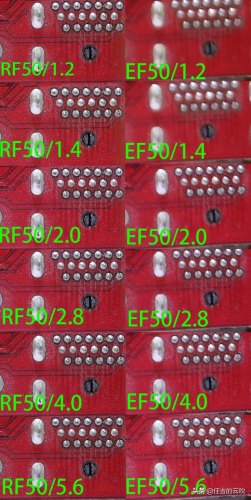 百分之百边缘部分进行对比。EF50/1.2镜头到了5.6光圈才勉强变得清晰了一点。而RF50/1.2在1.2光圈已经锐不可挡。