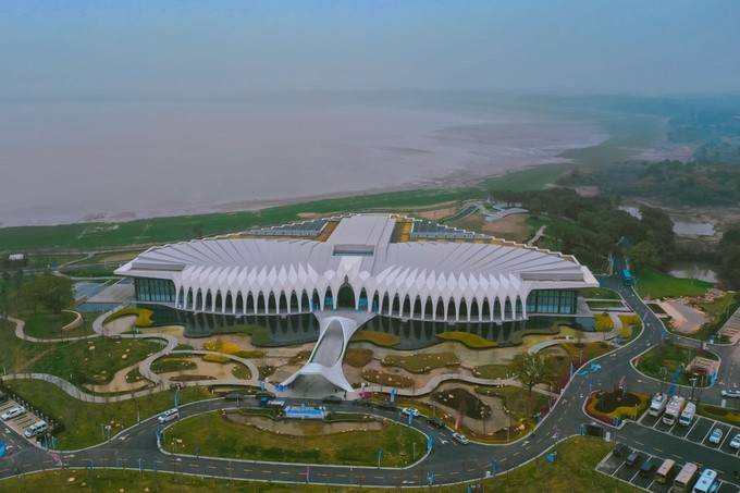 第二届鄱阳湖国际观鸟周仪式在鄱阳湖生态文明会展中心举行,场馆外形航拍视角像极了飞翔中的白天鹅,大气磅礴,距离鄱阳湖水域很近。