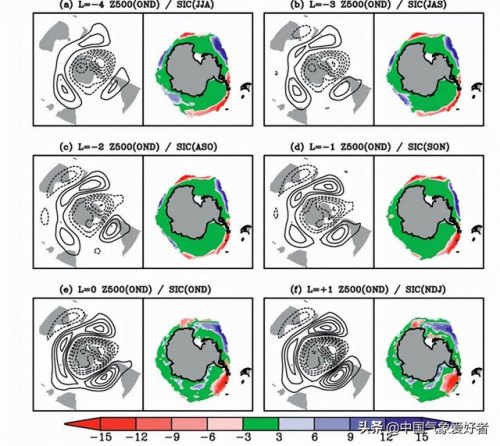 图24 10-12月南极500hPa高度场和超前4个月-滞后1个月的南极海冰空间模态,其中南太平洋外海和威德尔海偶极明显。摘自Wu(2011)