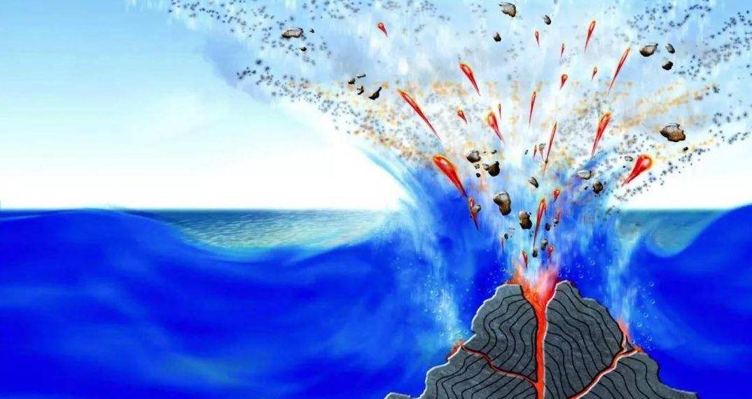 如果大量的岩浆在极短的时间内发生喷发,那么会出现什么问题呢?随着岩浆喷发量不断增多,火山口就会越来越塌陷,在海底山体中形成一个巨大的凹陷,这就好比我们往河流中扔进一块石头,在石头沉入河底时,会在上面形成一个巨大的凹陷的圆形,石头体积越大凹陷的面就就越大。