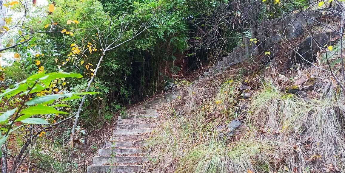 南方的冬天能看到稀疏的绿色农田,沿着亭子一侧的小阶梯下山,花果山残缺的围墙连同阶梯一起,与茂盛的植物混为一体。