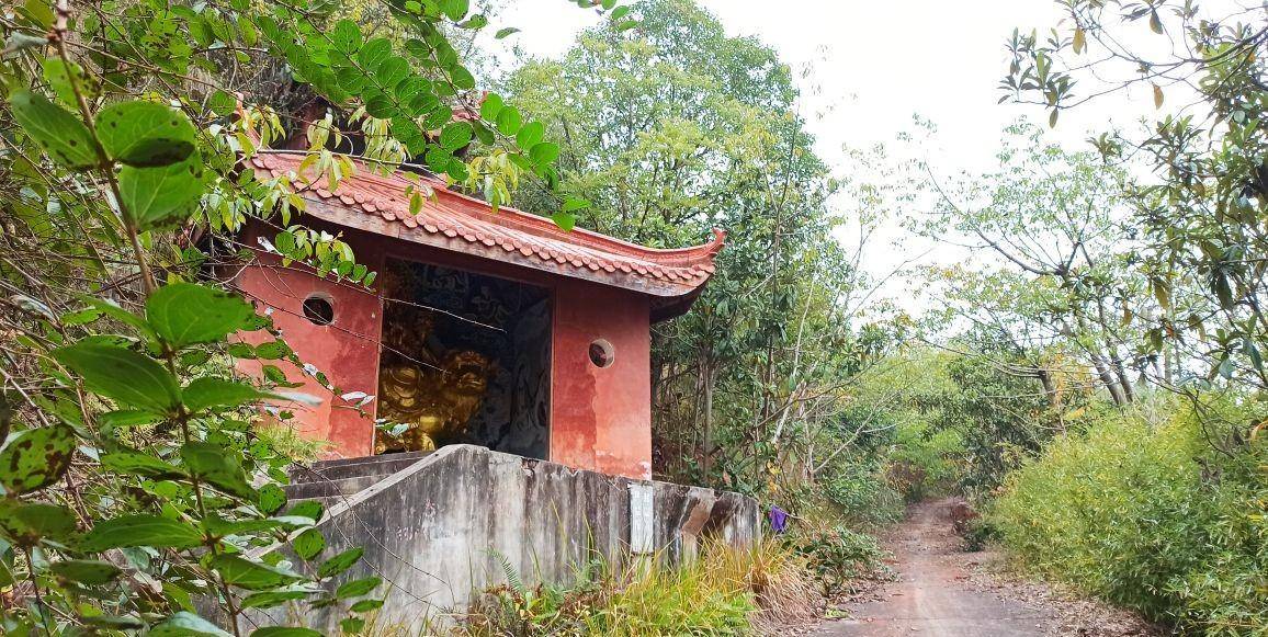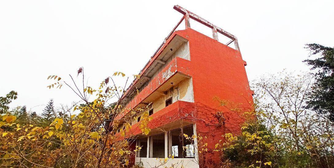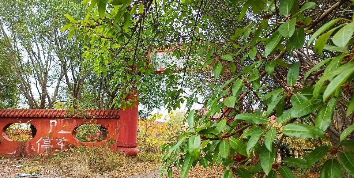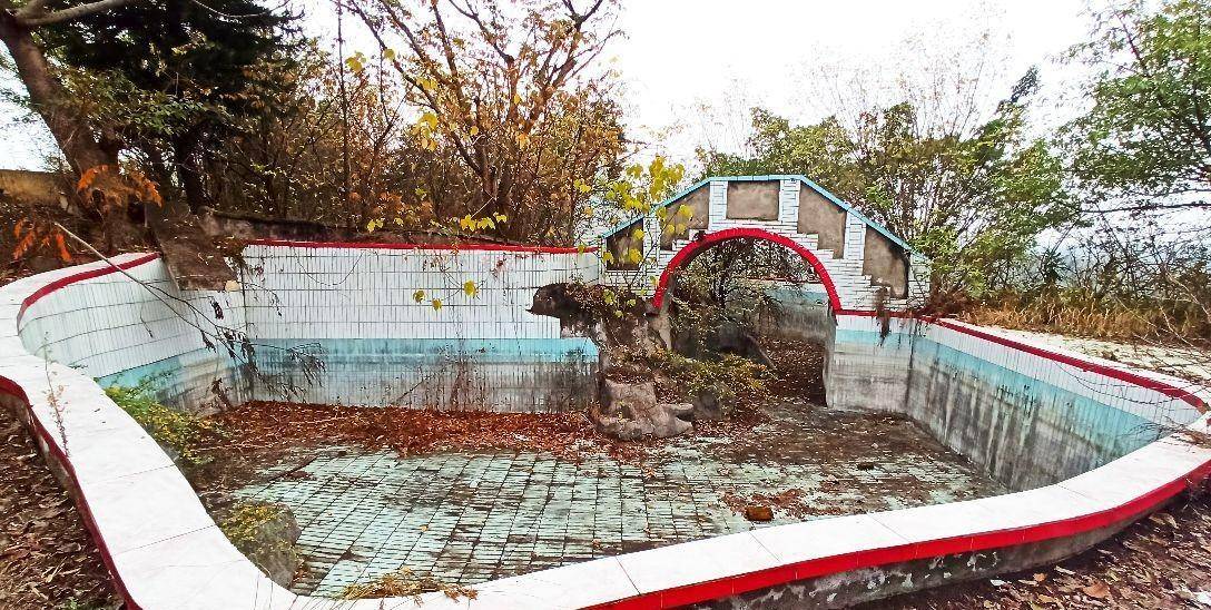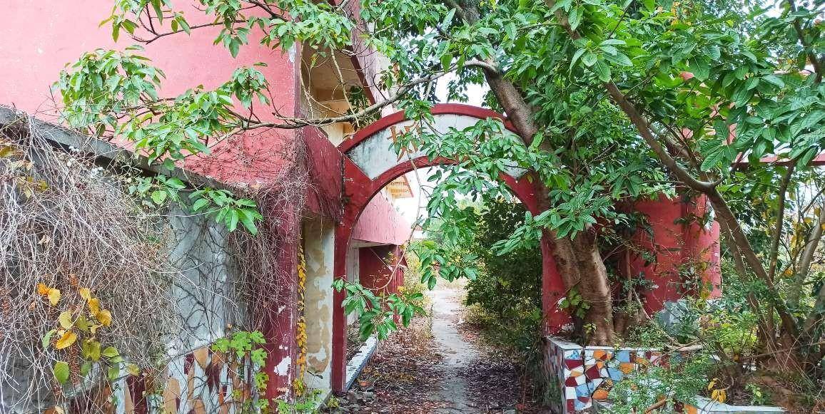 如今的花果山已经荒废,从堆积满垃圾的山门进入花果山,山门后正对的一座两层楼房,由于地处在山脚下,被杂草所掩盖,潮湿的墙体看上去略显阴森。