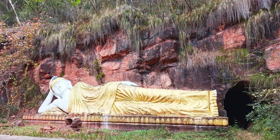 再往前走,一座卧佛静静地躺在山边,十多年前,因松林的同学提议,几个同学邀约着一起去花果山游玩,零散的记忆里,两个同学还进了卧佛脚边的山洞里探险。