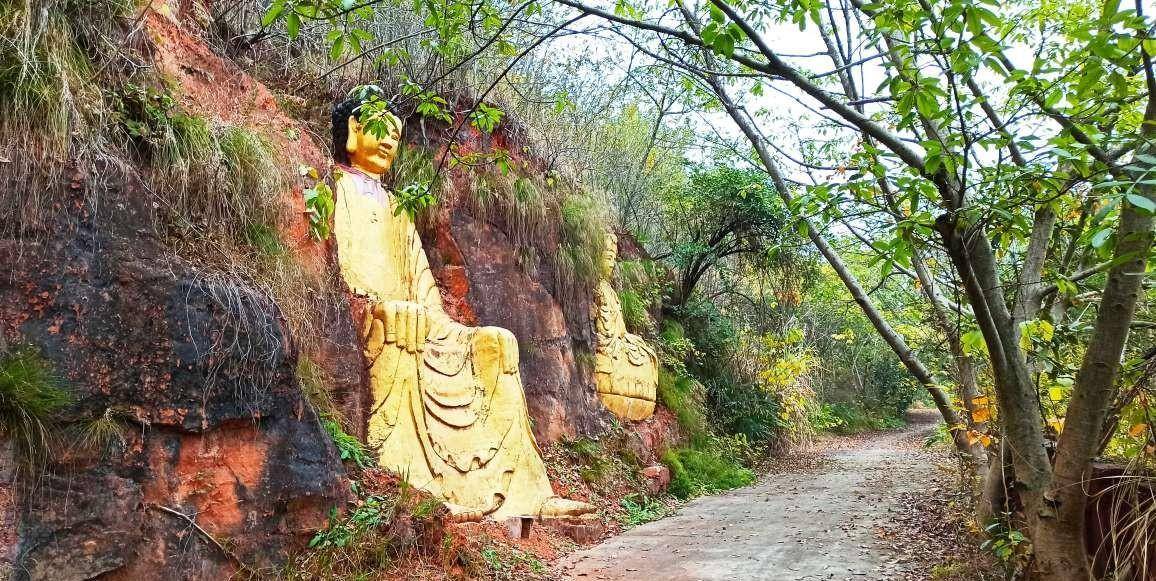 去花果山山顶的路上,三尊佛像石刻出现在山壁上,离石刻不远处还有一座单独的佛亭,佛亭里的壁画从远处看依旧生动清晰。