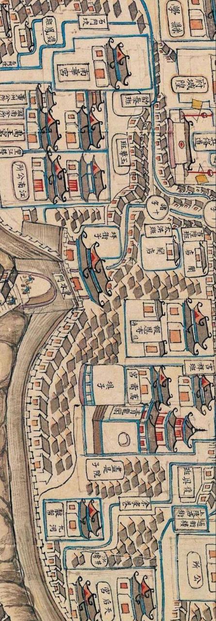 上图就是放大的一个城门——东水门,今天东水门的城门和城墙,早就淹没在历史的洪流之中了,今天东水门这里出名的可能就是东水门大桥了,但是看上面清代的地图,发现,原来这里还是有很多建筑的:万寿宫、江南共所、湖南公所、黄州公所、禹王宫、望江楼、城隍府、报恩寺、青龙阁、公所、天后宫、南华宫、县学,还有很多“班”,估计就是戏剧的班底。可见,清朝的时候,东水门附近可是重庆府和巴县的文教之地。另外,江南共所、湖南公所、黄州公所三个公所,是不是也在反映那段湖广填四川的历史呢?