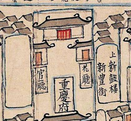 上图是重庆府衙的平面图,从图中可以看出,清朝衙门的大致结构,有花厅、官厅等。另外,还有新丰街和鼓楼。另外,在府衙附近是大片的民居。