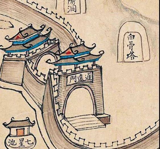 从上图看得出来,通远门附近是有个七星池、白骨塔的,现在已经找不到了。而且重庆的城门,在清朝都是由瓮城的。