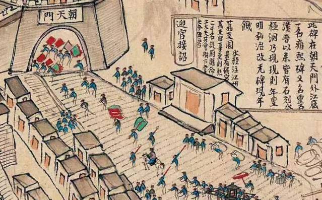上图是清朝时期的朝天门,可以看到,朝天门一出来就是台阶,台阶的尽头是很多的船只,另外让人想不到的是,在朝天门码头这里还有民居。另外,图中还有一顶轿子,旁边还有类似华盖的东西。前边有举彩旗的,这应该是朝廷大员来了吧。这样画,也正好体现了朝天门的作用和地位,正如右上角文字所述。