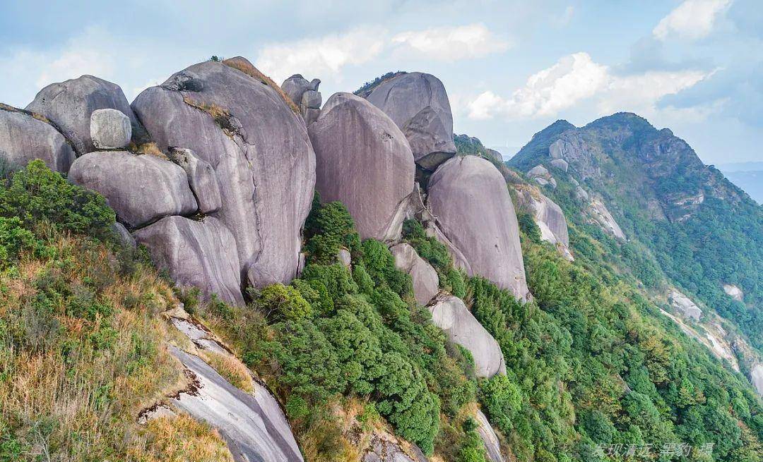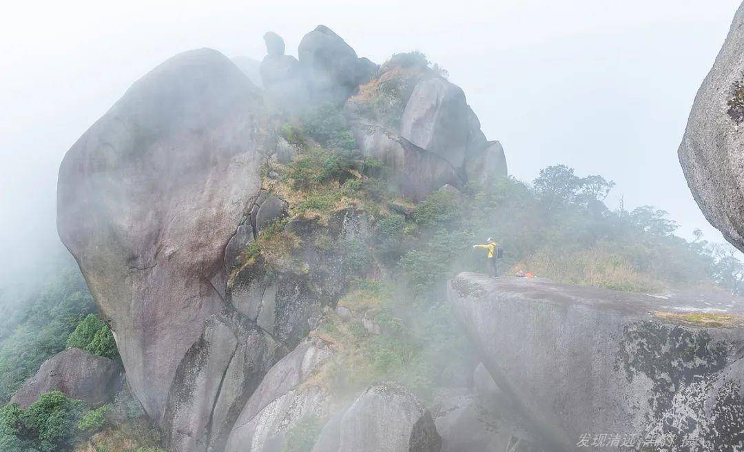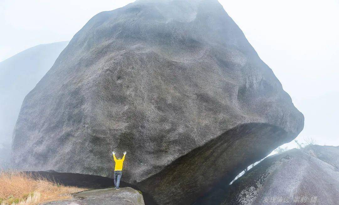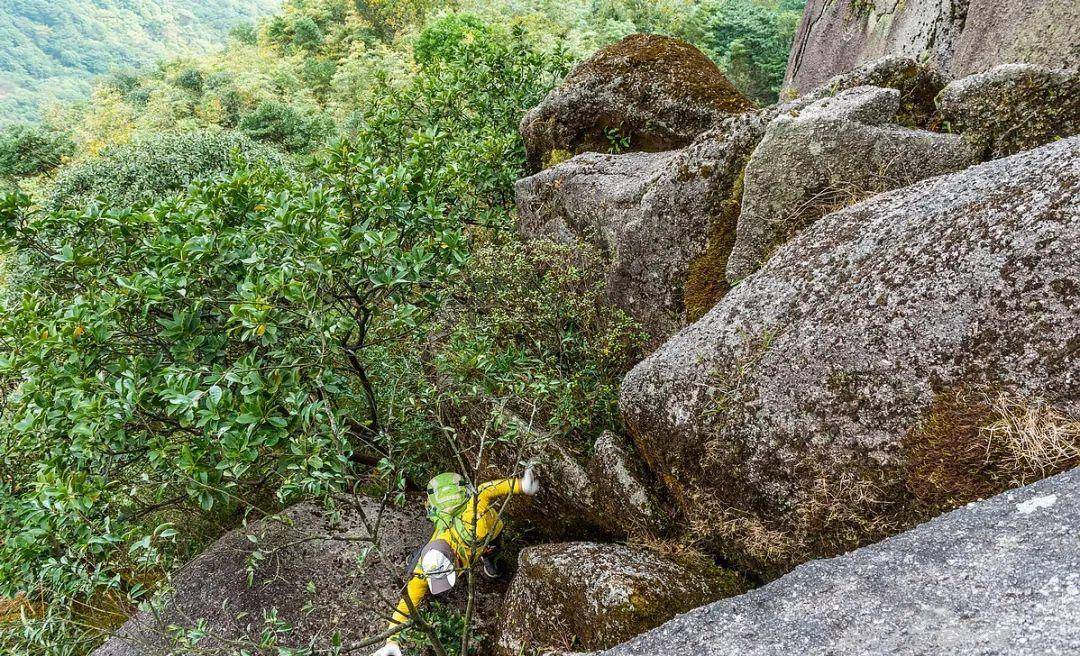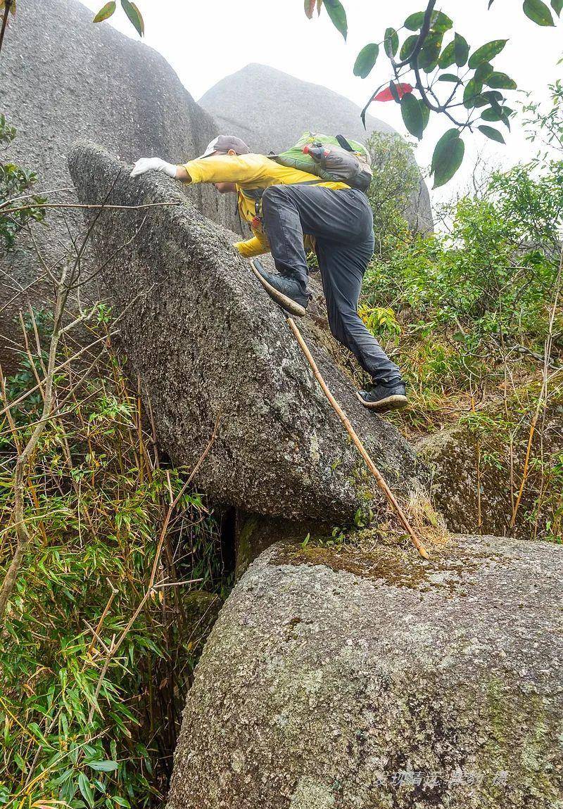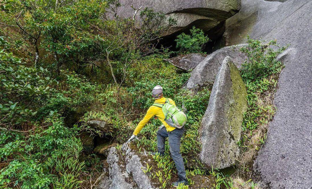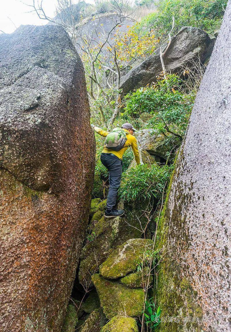 都说韶关始兴龙斗峰悬崖峭壁很多,十分难爬,但龙斗峰属于沉积岩山体,在石头上容易找到抓手和撑脚的地方,所以攀爬起来并不困难;而这座山峰由花岗岩构成,长年的风化剥蚀,让巨大的石块像巨蛋一样圆圆溜溜的,根本找不到抓手的位置,所以攀爬难度成倍增加了。