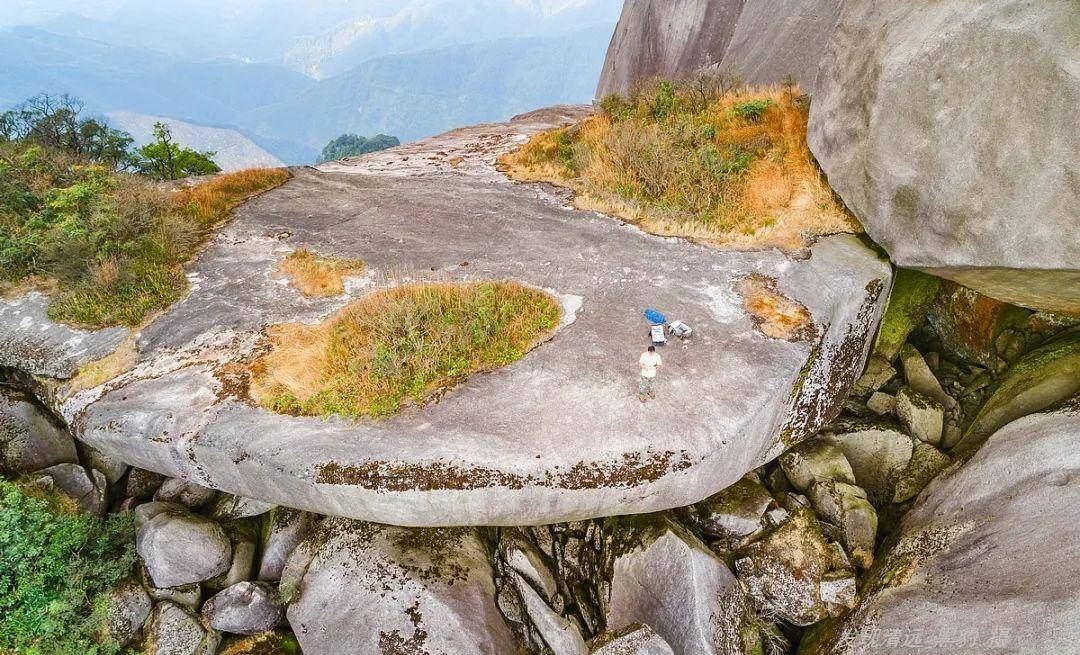 随着能见度越来越高,我放飞无人机从不同角度来打量这个神秘巨石阵。原来我们身处的地方是一个方圆数十平米的花岗岩石台,石台下方被无数石块托举起来形成了一个巨大的空间。这正是石台顶名称的由来,也有人把这个山顶叫做仙人台。