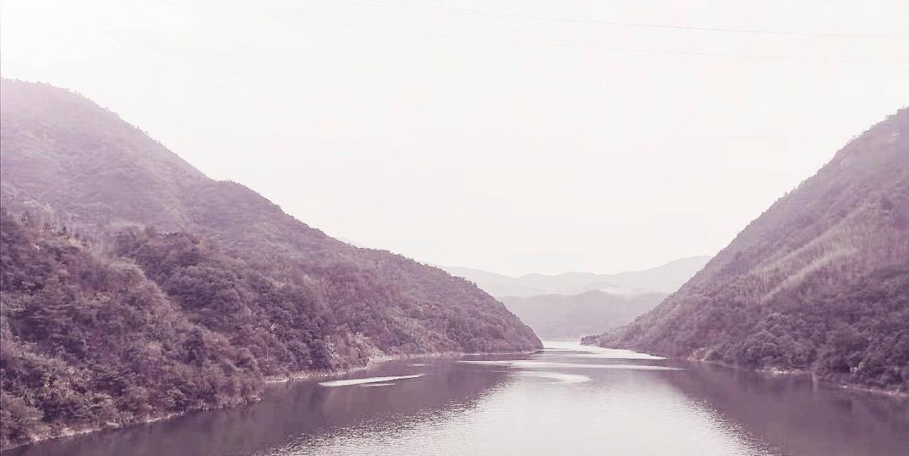 经过板道大桥的时候,我们略作停留,随手拍了几张照片,由于是逆光,照片效果不是很理想。但猛然看到山峦重叠,山色深绿低沉,一汪清水横在山间,微风习习吹皱了水面,仿佛给水平添了几分愁思。