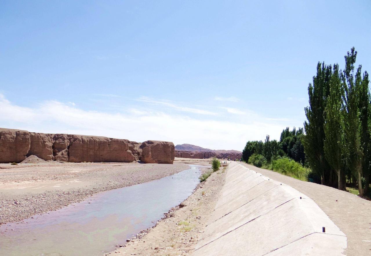 从敦煌市西南行驶不远就可以看见党河,党河是甘肃西部疏勒河的支流,流至鸣沙山,至敦煌市之后注入疏勒河,是我国唯一的一条由南向北的地渗河流。河床北岸为寸草不生的戈壁滩,南岸是透迄蛇曲的沙山,西千佛洞就位于沙山尽头的河床北岸陡崖上。