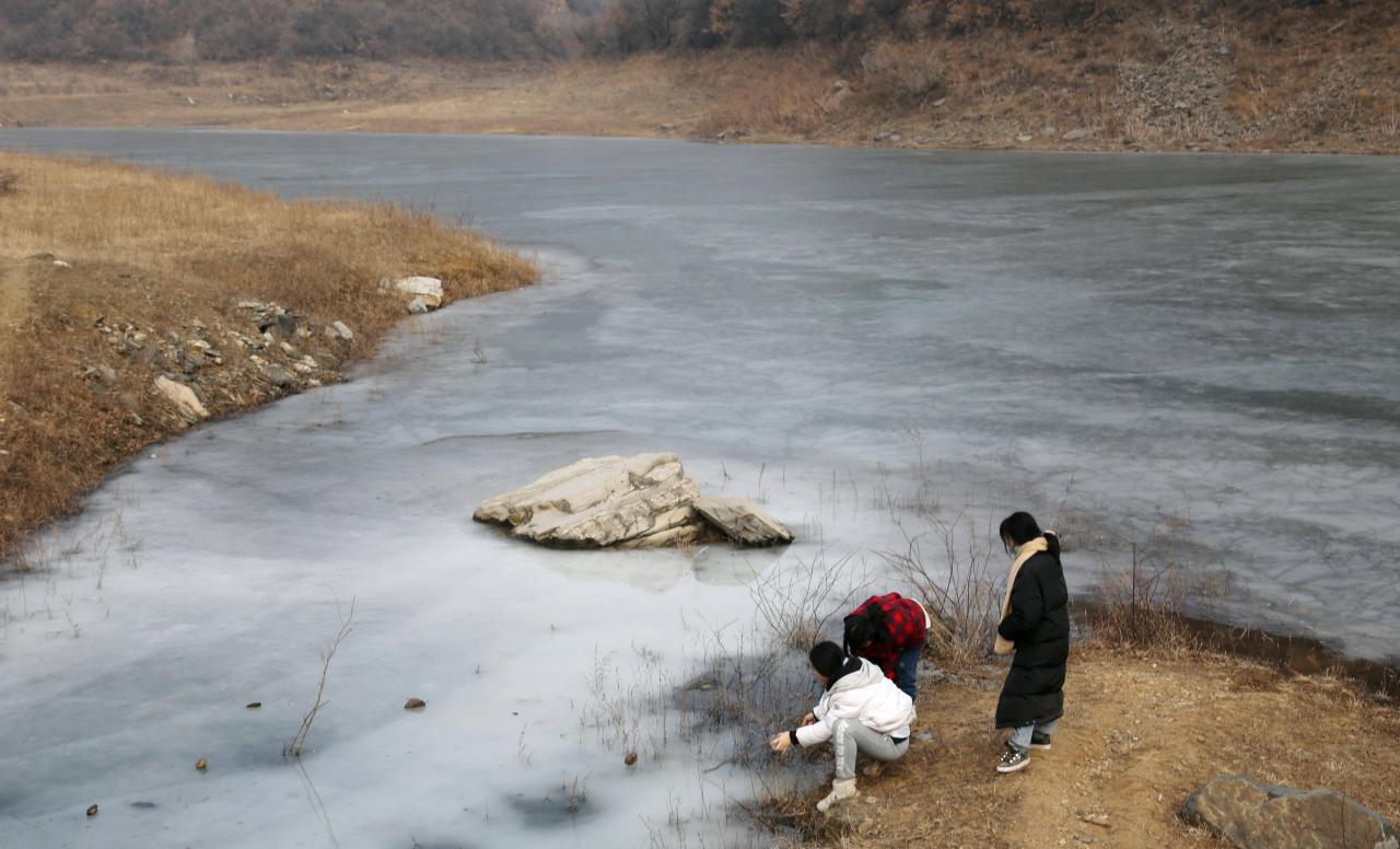由于孩子们要往水库后面看冰挂,为了防止孩子们淘气跑上冰面发生意外,摄影师和大娘简单聊了几句,就急匆匆地去追赶孩子们了,带着孩子们看了冰挂,在水库边玩耍了一会。担心山里天黑得早,路又崎岖难走,便决定原路返回。