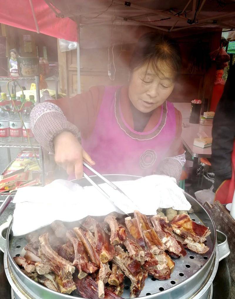 下得香炉山又到香炉山索道大门处,此时的我肚子也饿得咕咕叫,下车处正好有景区不少卖小吃的,走过一卖清蒸腊排骨的摊位,一阵阵肉食飘香让人馋。停下了脚步,买上了两大块,一边细品美食,一边和卖者开聊起腊排骨来了。腊排骨是民间老百姓为了储存肉食而想出的办法,很多地方都有制作,这里的腊肉、腊排骨是我吃到的最美味之一。这个选用的腊排骨来自她们山里自己家里的,蒸出来的味道原汁原味。制作过程简单,但一定要注意蒸足够的时间,而且腊排骨的种类不一样,有的腊排骨非常难蒸透,就要适当延长时间,否则吃起来很费劲。