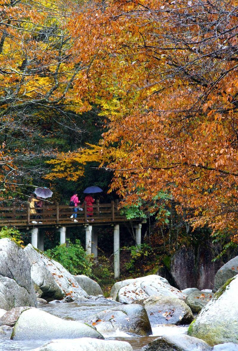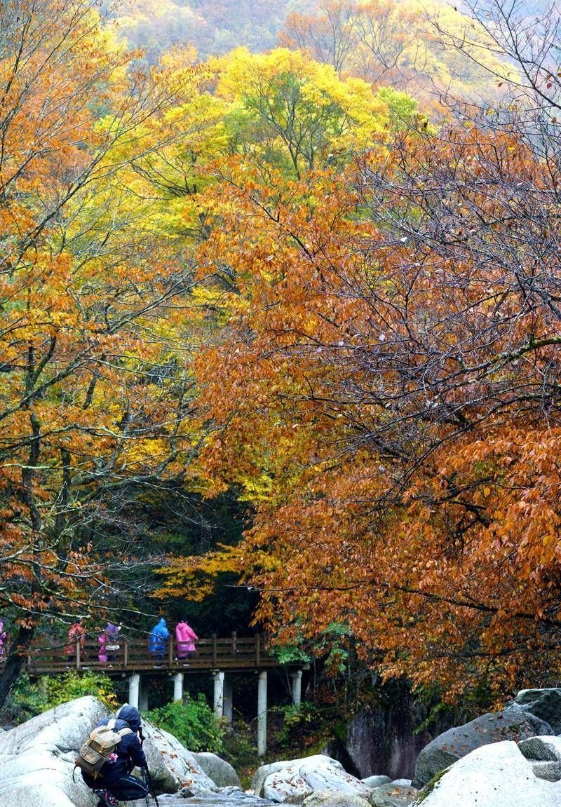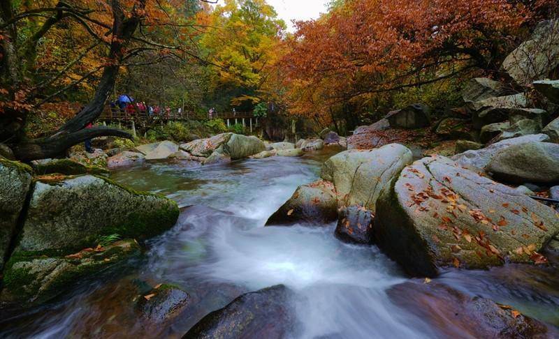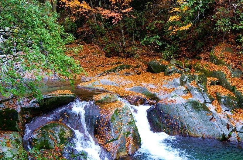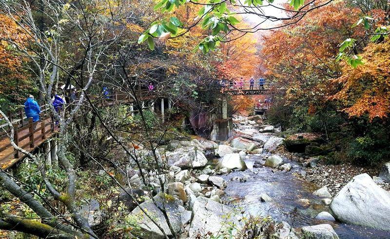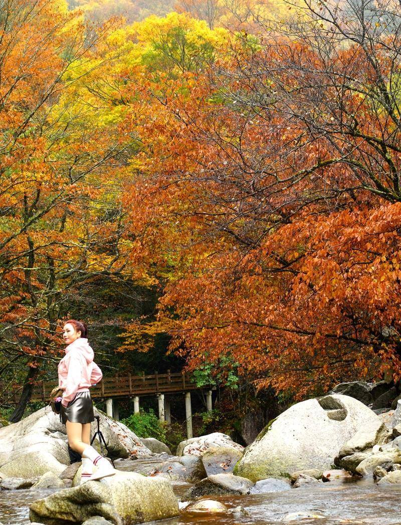 黑熊沟是那么的精致,红叶,清流,怪石,不光可以欣赏两边的红叶,还可以看到清澈见底的溪流,一会潺潺直下,一会又静止一汪碧玉,溪水与红叶,与怪石构成了一幅幅色彩斑斓的天然画卷。