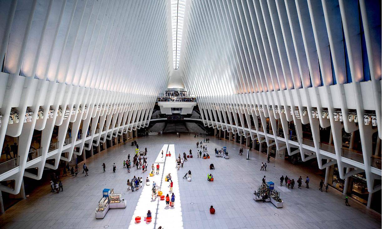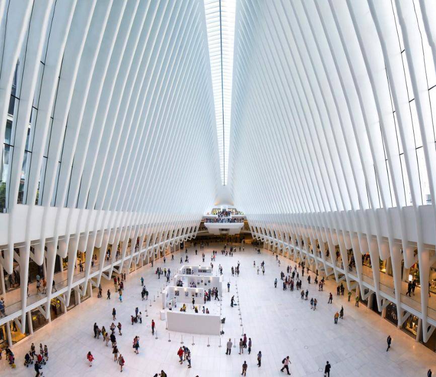 世贸中心火车站位于世贸中心建筑群内,从这里可以乘车去新泽西州,也可以在该站搭乘纽约市的地铁和巴士。建筑的主站房The Oculus像一只飞行中的鸽子,是钢铁和玻璃建造的结构。