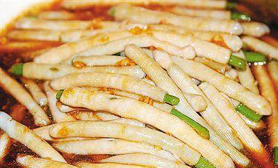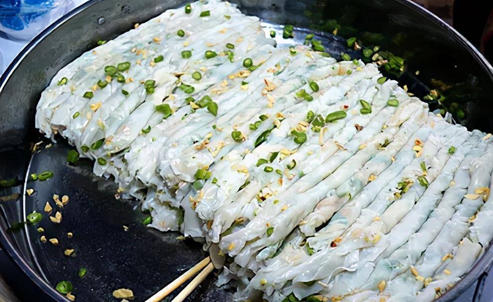 猪肠头是用米浆制作而成的,里面卷入椰丝、花生、木瓜丝等,浇上香油和酸醋,酸甜可口,风味独具一格。