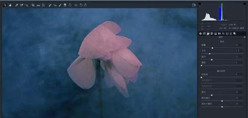 按住Alt键并拖曳“半径”滑块至0.8,荷花细节较粗的边缘区域将应用锐化效果,而图像中柔和区域呈现灰色没有应用效果。