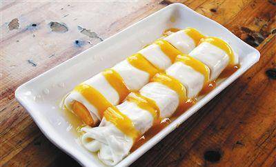 芒果肠粉是一道色香味俱全的甜点,口感软滑,芒果香味浓郁,滋味甜美,吃起来有滋有味。