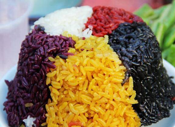 五色饭是少数民族的特色美食,用天然植物把糯米染成红、黑、黄、紫四种颜色,与白糯米一起蒸熟后植物清香味与糯米香味扑鼻而来,五彩缤纷甚至美观。口感软糯,且有一定的养生功效。