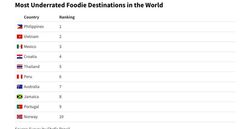 根据国际美食网站Chef's Pencil进行的一项调查显示,菲律宾是世界上美食被低估最严重的国家之一。