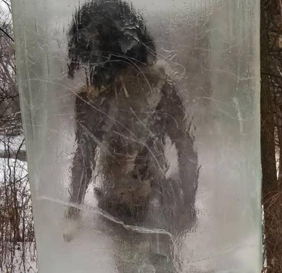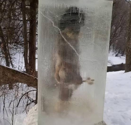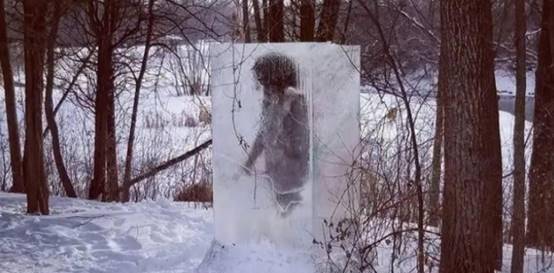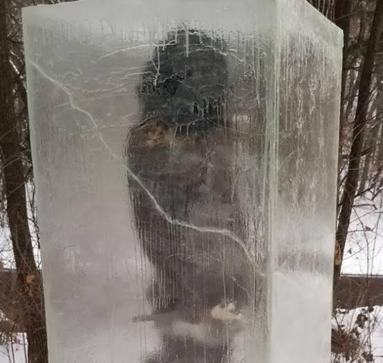 从外观上看,就如同有个人被冻在了冰块里面,这种奇特的艺术品让人瞠目结舌。根据雕刻者的介绍,设计这个雕像的初衷是为了鼓励人们外出,放下手机到外面的世界走走看看,不然就如同冰雕一样困在了原地,永远都无法出去。