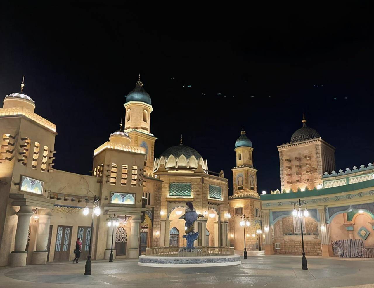 漆黑的夜色下,城堡发出了点点微光,水池中的雕像,高大而庄严,复古的房屋相连,串成了美好的童话故事,天上繁星闪烁着,地上的城堡,也诉说了人间的浪漫。