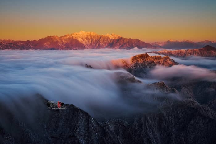 今天的天气不是很好,徒步到半山腰打卡之后,就往回走拍日落了,今天的日落就随便看一看吧,日落后有点饿了,到酒店的餐厅找吃的,168元每人的汤锅不算贵,我决定还是吃自己的自热米饭吧,香喷喷,这包薯片和我一样,都发生了高原反应,这里海拔3600,晚餐后到公共洗手间洗漱,早早睡觉准备迎接流星雨的到来,凌晨四点外面刮着大风零下7度,抬头看看星空人间值得,记得带手套和支架,一个多小时看到了几十颗流星,浪漫至极,山顶的风太大,实在扛不住回房间修整一小时,准备去看牛背山的灵魂日出,日出时间是八点左右,但我建议7:20就过去,因为日出前的光影更美。