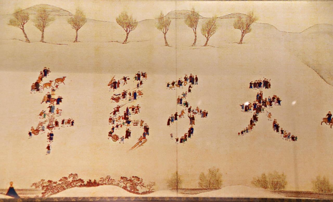 为了欢迎皇帝南巡回京,当地官员和百姓一起在天桥边举行了一场大型团体操表演,用人组成“天子万年”四个字,这种表演形式历史悠久呀!