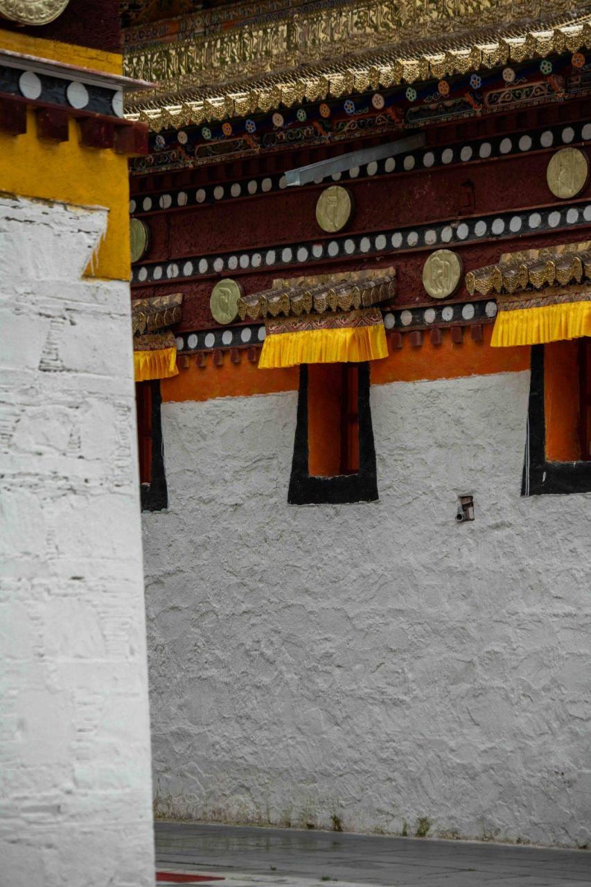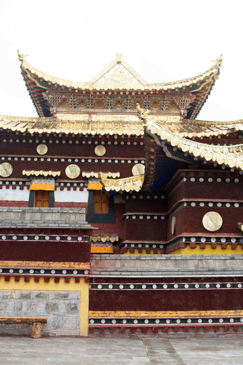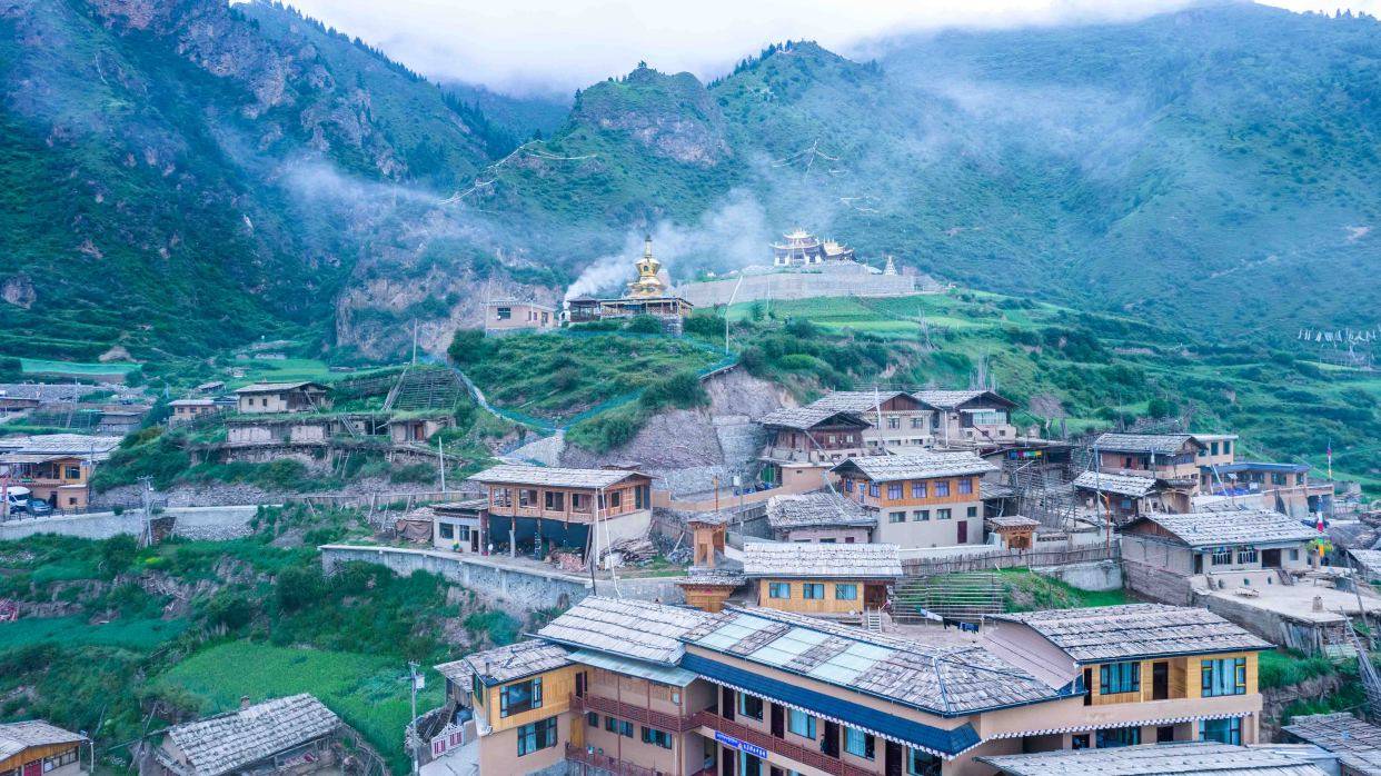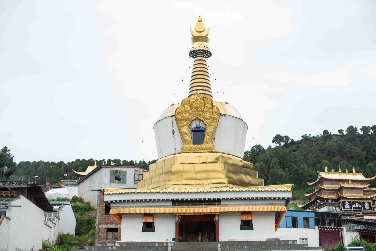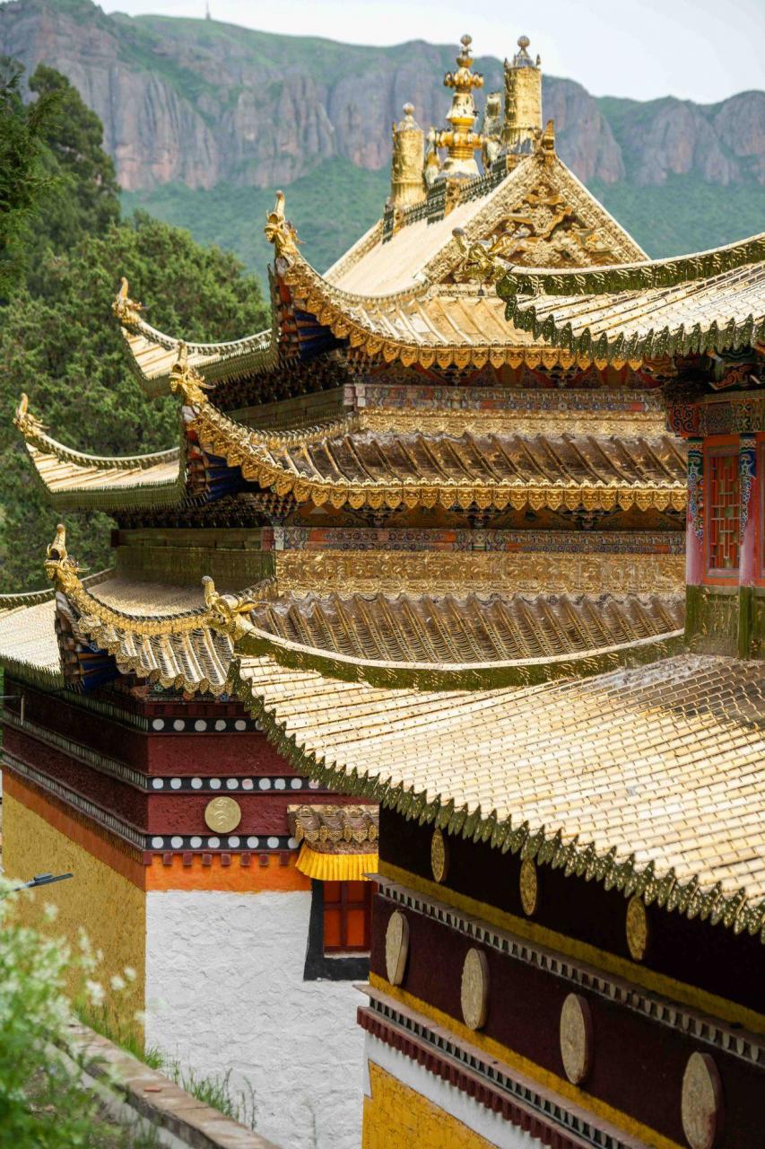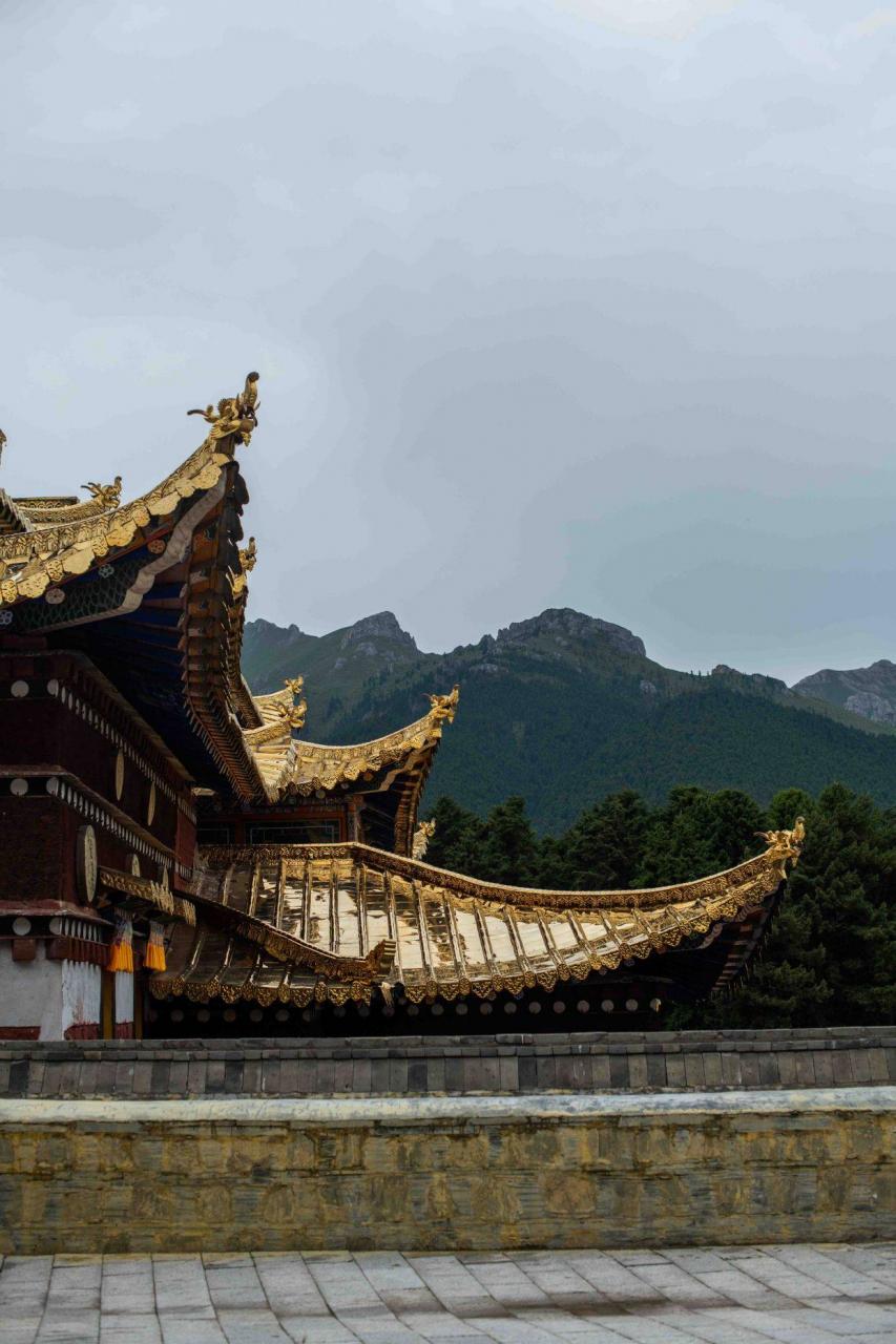 就这样,白龙江两岸的人们用不同的方式,传达着自己对信仰的执著,守护着同一片家园。红白色的建筑,金碧辉煌的穹顶就跟宫殿一般,各个大殿依山势而建,错落有致,寺院入口处的金顶白塔高大巍峨,显然是每一座大殿的顶都镀了金。“金盆养鱼”是对小镇地理环境最形象的概括,这里四面群山环绕,林木葱郁茂密。