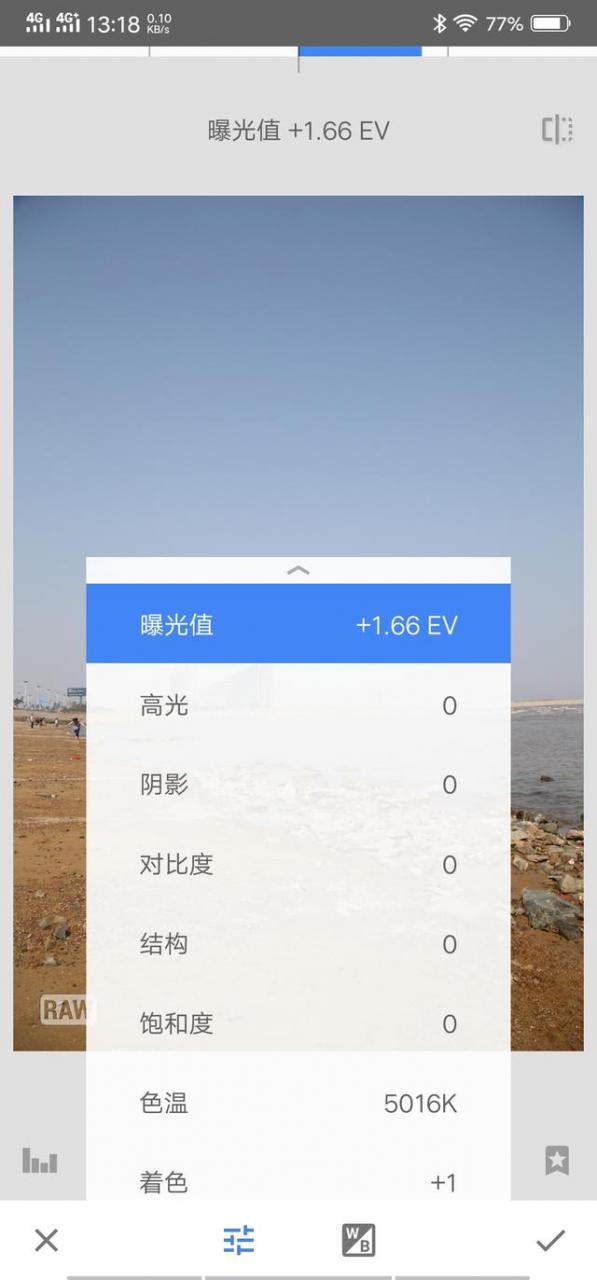 普通的jpeg照片导入Snapseed后是没有RAW显影选项的,但如果导入的照片是RAW格式,软件会自动在第一个位置出现这个选项。另外,在显影的主界面,照片左下角也会有一个RAW的图标,从这里也可以判断出所修的照片是不是RAW格式。