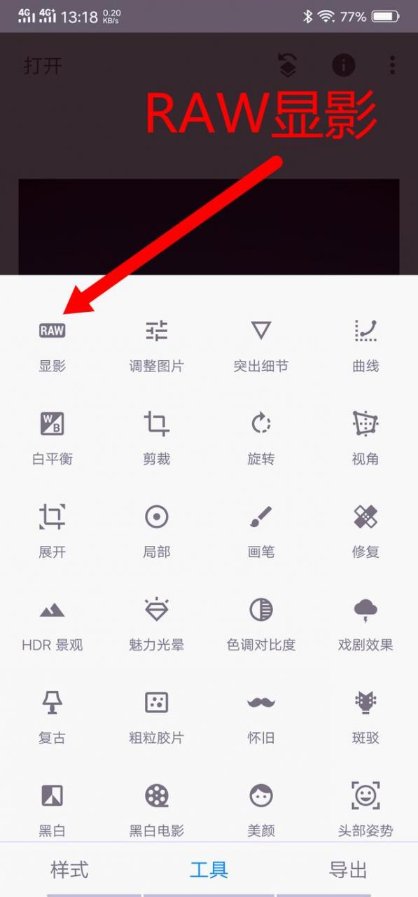 Snapseed可以识别出照片是不是RAW格式,当它发现你导入到软件里的照片是RAW格式,它会显示出相应的提示,想知道是不是成功导入了RAW格式,可以通过查看工具菜单中有没有“RAW显影”选项来判断。