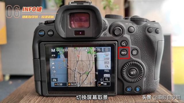 显示拍摄时的相关信息,按INFO键的时候,画面上就会显示光圈、快门速度、感光度、曝光标尺等当时拍摄信息。另外切换显示器取景和取景框内取景,也是这个按键。