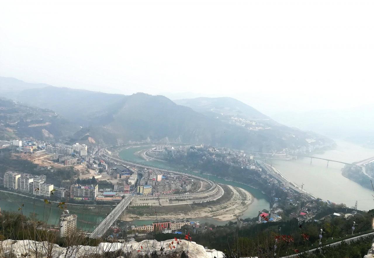 下了火车,跨越旬河上的廊桥,到了县城,我向路人打听,得知看“太极城”的观景台在一座山上,乘出租大概15分钟就到了,走路则需要1小时。没有多想,我从地图上定位“太极城观景台”的位置后,就开始走,一直走到俯瞰“太极城”的平台上。