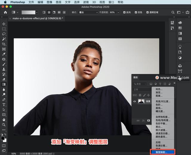 渐变映射可以为任何高对比度的黑白照片赋予令人惊艳的色彩效果。需要ps软件的朋友可在本站下载,关注本站,学习Mac软件使用方法!